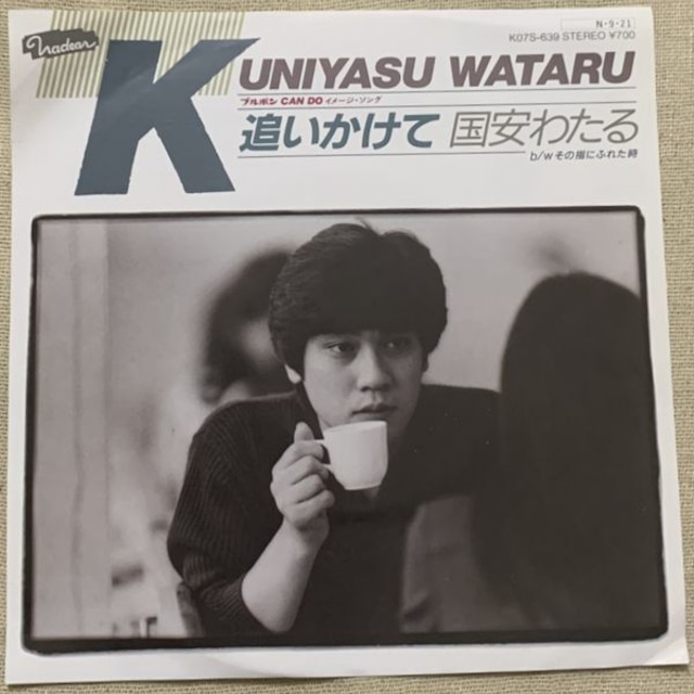 A面 「追いかけて」 作詩・作曲/国安わたる、編曲/石川鷹彦 B面 「その指にふれた時」 作詩・作曲/国安わたる、編曲/石川鷹彦 ブルボン CAN DO イメージ・ソング 1984年、定価700円、キング、番号 K07S-639 ジャケットの状態はシワが少し~多少 盤はヘッドフォンで試聴済みで、当時のアナログ中古盤としては特に問題ないように思われました