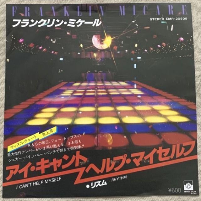 A面はフォー・トップスのソウル・ナンバーのイケイケのディスコにアレンジしたナンバー B面は後半に向けてパーカッションがだんだん盛り上がってくる高揚感のあるポップ・ナンバー https://drive.google.com/file/d/1ampuVERNjVG0Cx2h_v3SnrRq6h8iYMXb/view?usp=sharing 1978年、定価600円、東芝EMI、番号EMR-20509 フランクリン・ミケール Franklin Micare A面「アイ・キャント・ヘルプ・マイセルフ」I Can't Help Myself B面「リズム」Rhythm ジャケットの状態はシワが少し 盤はヘッドフォンで試聴済みで、当時のアナログ中古盤としては特に問題はないように思われました