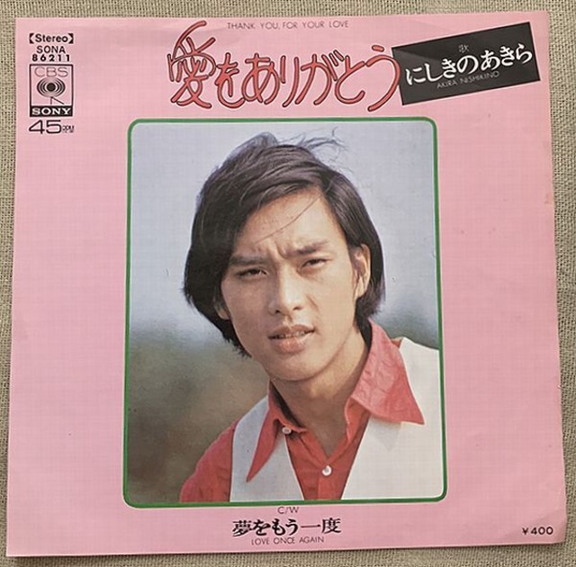 A面はいわゆるハチロク(8/6拍子)の哀愁歌謡 B面はファンキーなベースがゴキゲンなミディアム・テンポのグルーヴ歌謡 https://drive.google.com/file/d/1BPSk0lejQ2U0BzuQ8EdlIdOcCFuHI_Po/view?usp=sharing 定価400円、CBS・ソニー、番号SONA 86211 にしきのあきら A面 「愛をありがとう」 作詩/阿久悠、作曲/浜口庫之助、編曲/葵まさひこ B面 「夢をもう一度」 作詩/阿久悠、作曲/浜口庫之助、編曲/葵まさひこ ジャケットの状態はシワが少し 盤はヘッドフォンで試聴済みで、当時のアナログ中古盤としては特に問題はないように思われました
