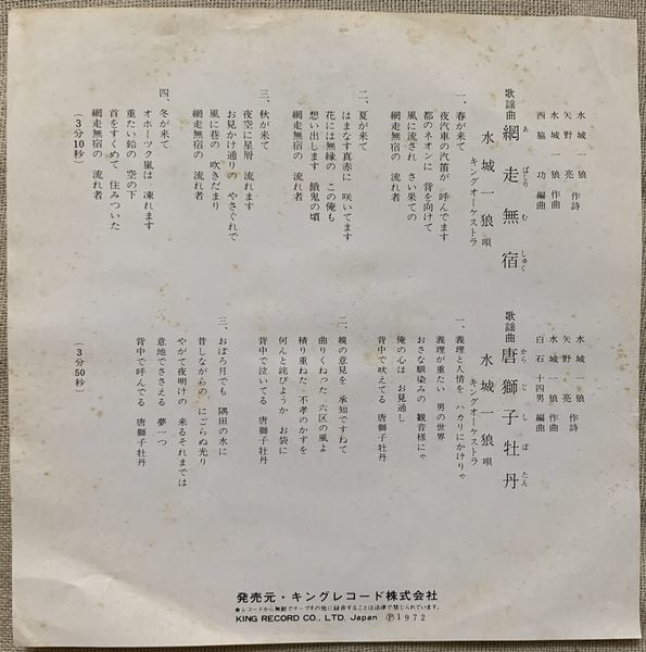 作詩/水城一狼、矢野亮、作曲/水城一狼、編曲/白石十四男