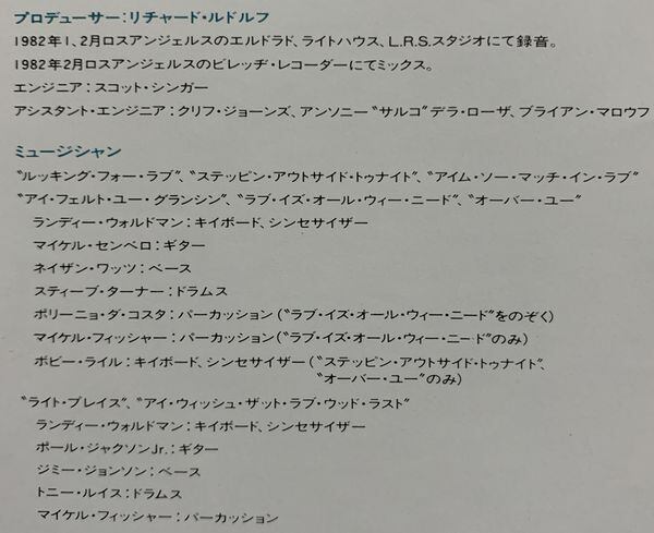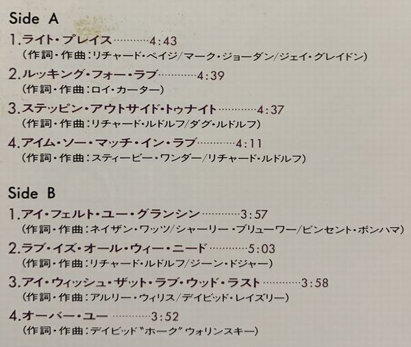 オススメ曲はリチャード・ペイジ(Richard Page)、マーク・ジョーダン(Marc Jordan)、ジェイ・グレイドン(Jay Graydon)の共作のグルーヴィーなこみ上げ系のナンバーのA1「The Right Place」とスティーヴィー・ワンダー(Stevie Wonder)作のメロウなA4「I'm So Much In Love」です
