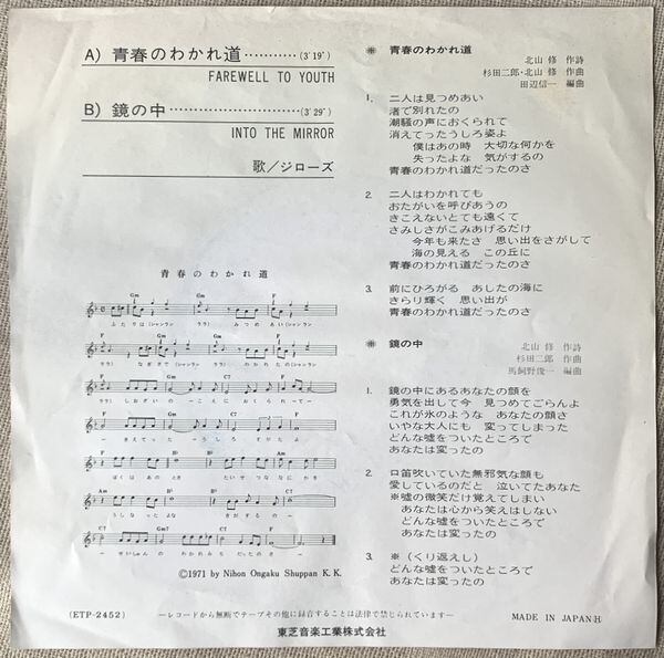 1971年、定価400円、東芝音楽工業、番号ETP-2452