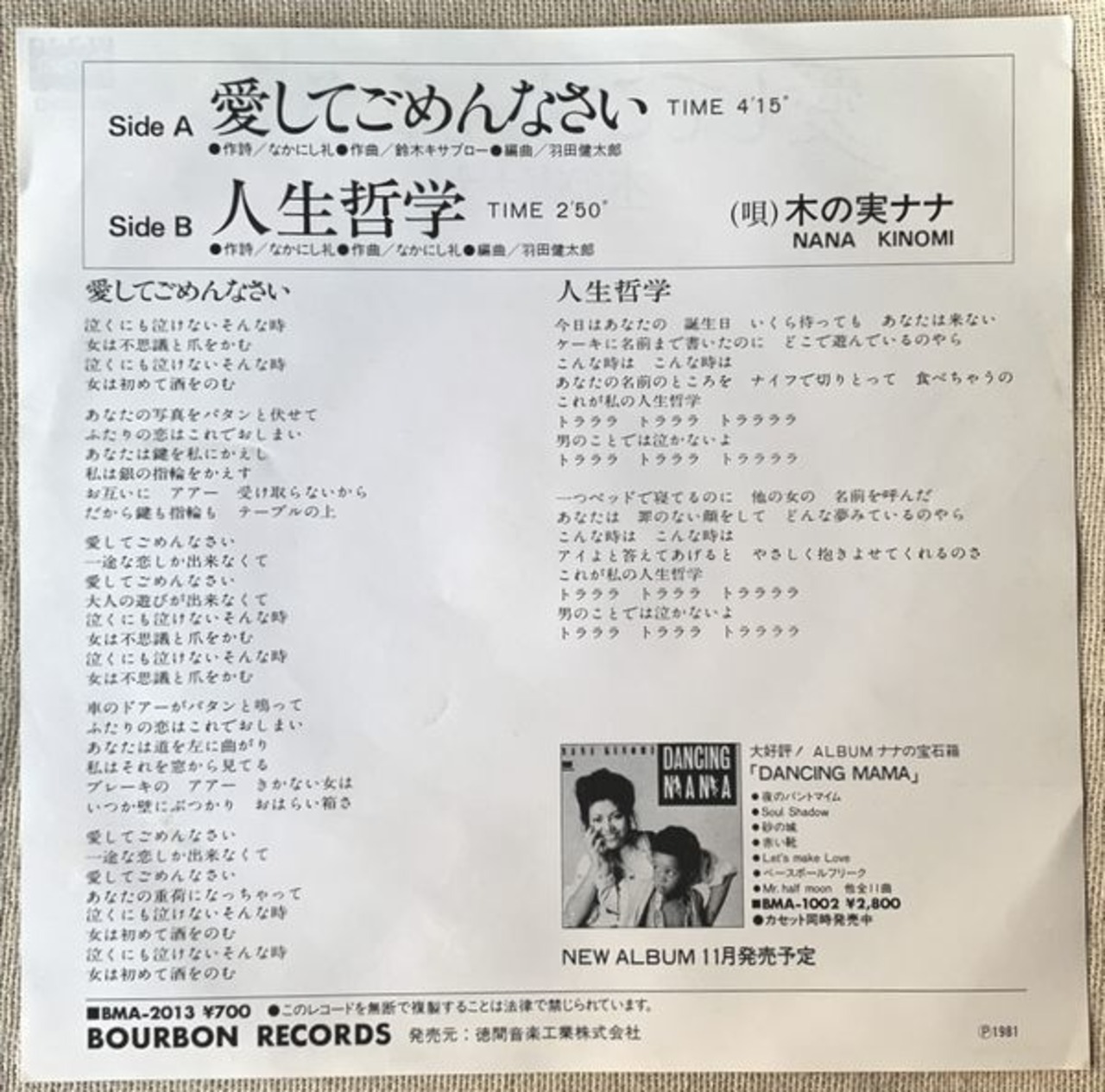 1981年、定価700円、徳間音楽工業、番号BMA-2013