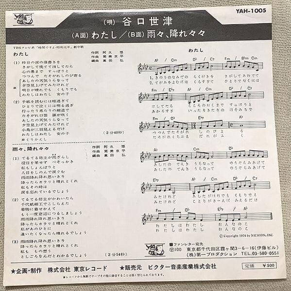 定価500円、東京レコード~ビクター音楽産業、番号YAH-1005