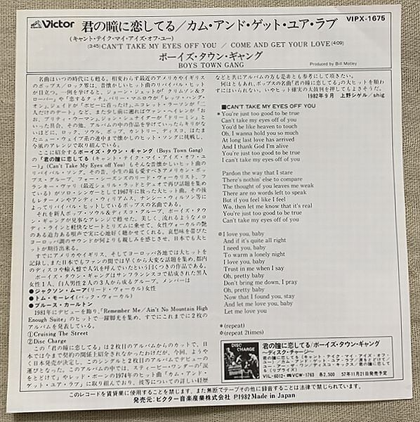 A面「君の瞳に恋してる(キャント・テイク・マイ・アイズ・オフ・ユー)」Can't Take My Eyes Off You