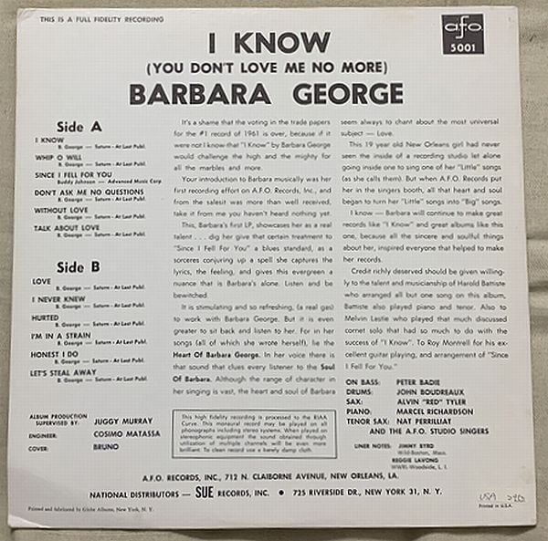 当アルバムのタイトル曲「I Know(You Don't Love Me No More)」で有名な、ニューオリンズを本拠地に1960年代に活躍した女性シンガー、オススメ曲は説明不要の名曲A1「I Know」とソウルフルでパワフルななヴォーカルがゴキゲンなA6「Talk About Love」です